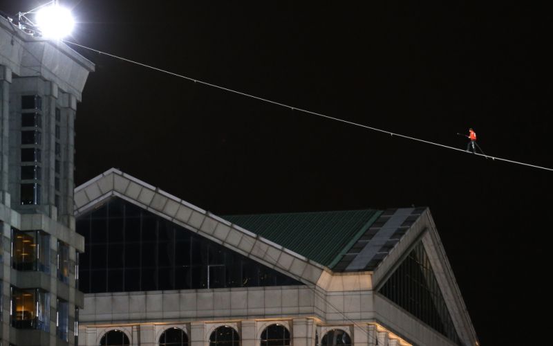 FOTO in VIDEO: Med nebotičnikoma se je sprehodil z zavezanimi očmi