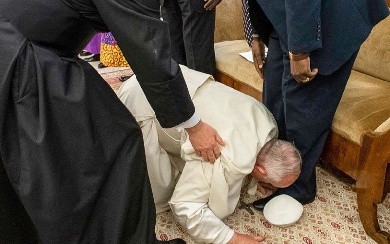 FOTO: Papež Frančišek na kolenih pred sprtima voditeljema, tekle so solze