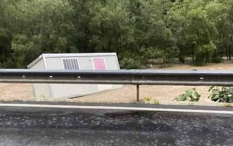 FOTO: V Idriji deroča voda odnesla covid točko. Domačini so se iz tega malo pohecali