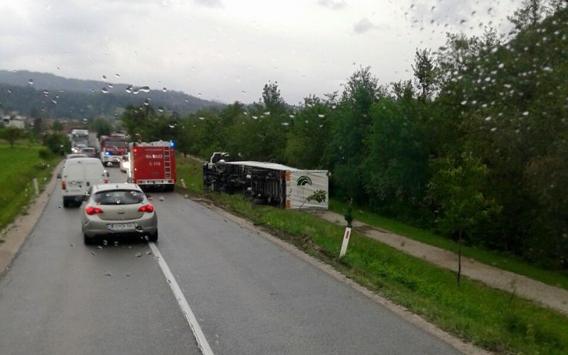 Okoli 8.40 se je na cesti med Mozirjem in Nazarjami, v bližini Delejevega jezu, tovorno vozilo prevrnilo na bok. Zaradi odstranjevanja prevrnjenega tovornega vozila je cesta polovično zaprta in promet poteka izmenično enosmerno, so sporočili s prometnoinformacijskega centra.