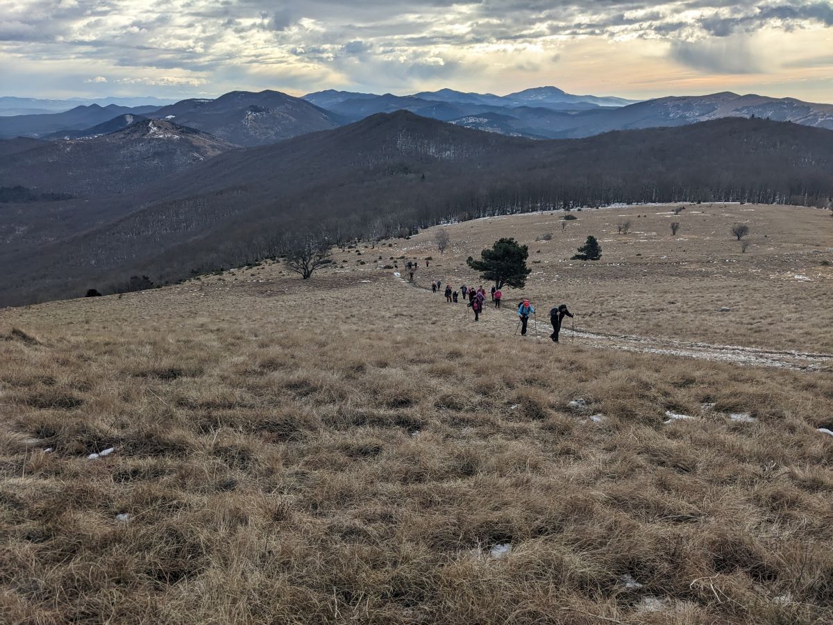 Kljub temu, da je bila skupina zelo velika, je bil tempo pohoda zelo hiter. Tako smo s postanki kmalu prišli pod vrh na travnik, s katerega se nam je odprl čudovit razgled na Istro in Učko v ozadju, na vzhodu pa na Kamniško Savinjske Alpe in številne griče pred njimi.