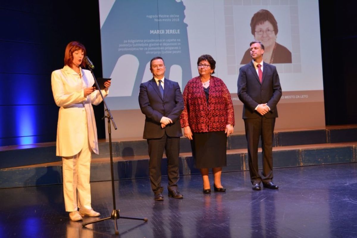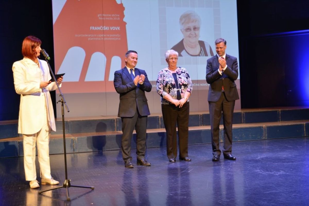 Polna dvorana Kulturnega centra Janeza Trdine je sinoči počastila občinski praznik, ki ga MO Novo mesto praznuje 7. aprila, in se tradicionalno na slavnostni seji zahvalila tistim občankam in občanu, ki so v minulem letu oz. skozi svoje dolgoletno delovanje na različnih področjih prispevali k razvoju tega mesta, ga kulturno nadgradili in s svojim delovanjem obogatili. Prejemniki letošnjih občinskih nagrad so: za dolgotrajna prizadevanja in uspehe na področju ljubiteljske glasbene dejavnosti in prostovoljstva ter za pomemben prispevek k ohranjanju ljudske pesmi Marija Jerele (nagrada MO Novo mesto), za uspehe na vzgojno-izobraževalnem področju Danica Rangus (nagrada MO Novo mesto), za dolgoletno požrtvovalno delo na področju prostovoljstva ter pomemben prispevek k izboljšanju položaja starejših, invalidov in upokojencev Nežka Ivanetič (nagrada MO Novo mesto), za pomembne trajne uspehe na področju likovne umetnosti in izviren pristop k umetniški dokumentarni publicistiki Samo Kralj (Trdinova nagrada) in Frančiška Vovk (grb MO Novo mesto) za prizadevanja in uspehe na področju planinstva in prostovoljstva. Naziva častni občan, kot smo že poročali, letos niso podelili.