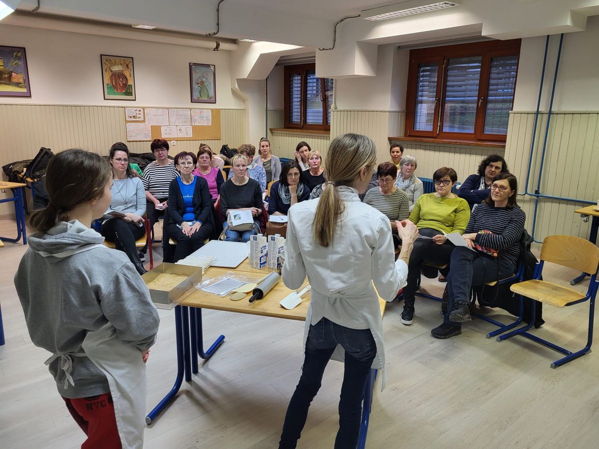 V četrtek, 15.2., nas je profesorica Grma Novo mesto - centra biotehnike in turizma Damjana Trbanc poučila, kako pripraviti kremno rezino. Na kaj vse moramo biti pozorni, kako mešati in kaj dodajati kremi, da je popolna. Kako pripraviti listnato testo ... in seveda na koncu smo rezine tudi okušali.