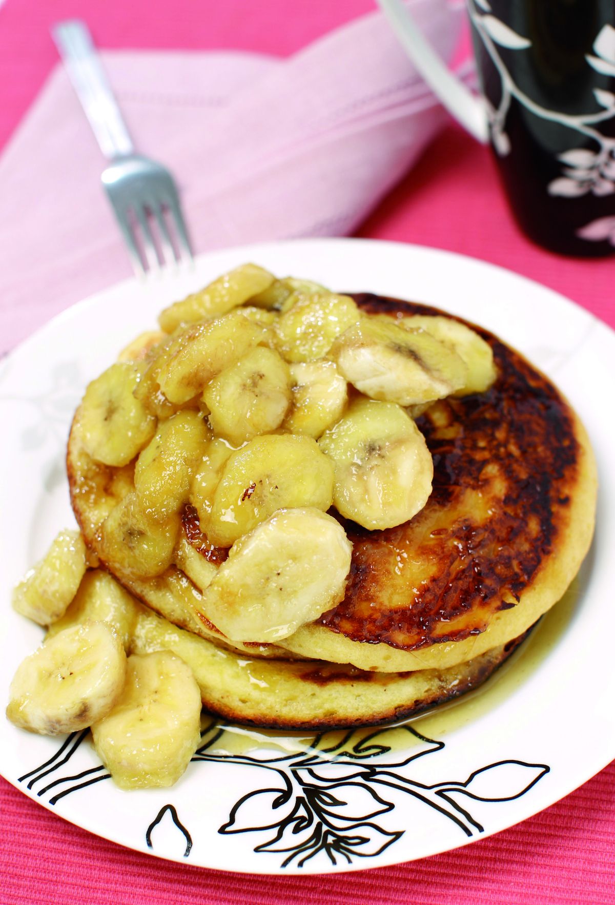 3. Testo premešamo, nato v majhni ponvi, namazani z maslom, spečemo ponvičnike s premerom 12 cm. Zložimo jih na kupček, prelijemo z javorjevim sirupom in ponudimo z dušenimi bananami.