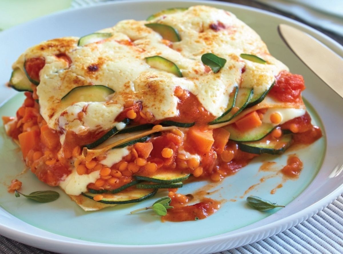- Testo prekrijemo s polovico rezin bučke ter s polovico omake iz leče in paradižnika. Na to zložimo preostale 4 liste testa, bešamelno omako, rezine bučke ter omako iz leče in paradižnika. Nazadnje vse prelijemo s kislo smetano, ki smo jo zmešali z naribanim sirom, in pečemo 35 minut.