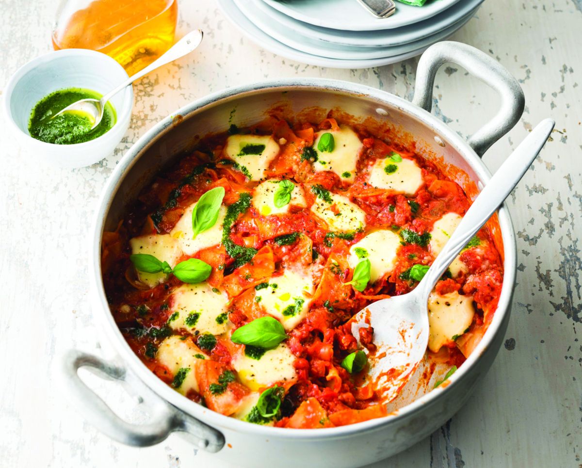 3. Liste za lazanjo natrgamo na drobne koščke in jih skupaj s paradižnikom, sokom in vodo dodamo v lonec. Vmešamo že žlico parmezana in zavremo. Solimo, popramo, nekaj minut kuhljamo in mešamo, potem pa lonec pokrijemo in na nizki temperaturi kuhljamo še 25 minut. Sploh prvih deset minut večkrat premešamo.
