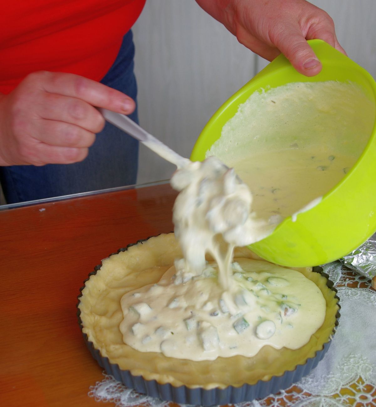 Narezane šparglje je na hitro – nekaj minut – prepražila na maslu (lahko olivno olje). V skledici je z metlico umešala jajca – iz enega je posebej naredila sneg - ter dodala smetano, sol, poper in nariban parmezan. V ohlajeno maso je stresla šparglje. Test je razvajala na okrog pol centimetra na debelo, ga dala v namaščen pekač in ga s prsti nežno pritisnila ob dno in rob modela. Na več mestih ga je prebodla z vilicami. Maso je nato vlila v model s testom in v ogreti pečici na 200 stopinj Celzija pekla dobre pol ure. Pita mora biti zlato rjavo zapečena. Pečena se naj kakih deset minut hladi v pekaču.