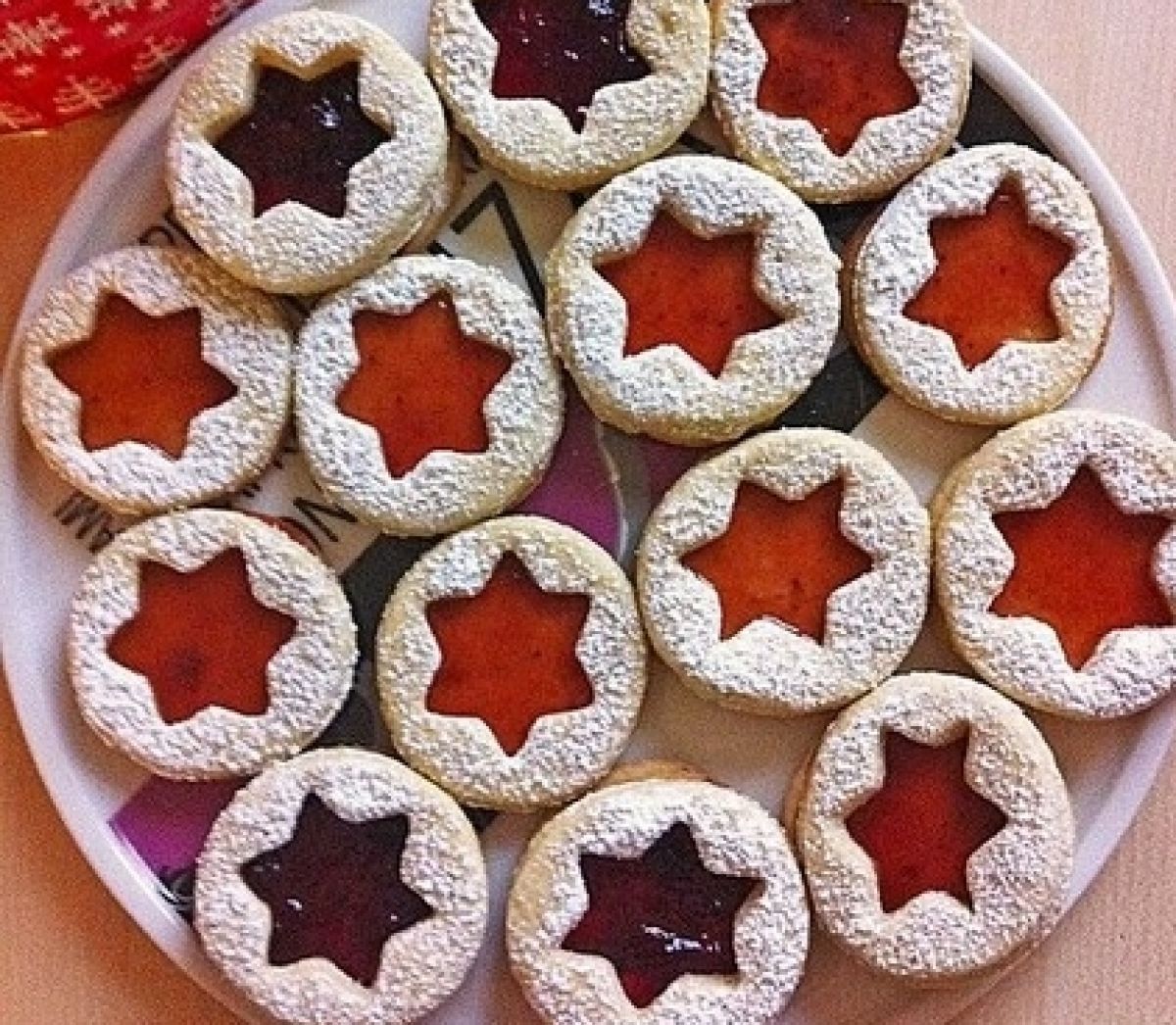 Sestavine: 350 g gladke moke, 100 g mletih mandljev, ščepec soli, 120 g sladkorja, zavojček vaniljevega sladkorja, ščepec cimeta, drobno naribana limonina lupina, 200 g masla, 3 rumenjaki, malinova marmelada, sladkor v prahu. Priprava: v skledo presejemo moko ter jo zmešamo z mandlji, sladkorjem, soljo, limonino lupinico in cimetom. Po mešanici potrosimo kose masla. Maščobo s konicami prstov hitro vgnetemo v suhe sestavine in mešanico pri tem dvigamo, da postane podobna drobtinam. Dodamo rumenjake in sestavine na hitro zgnetemo v krhko testo, ki ga oblikujemo v kepo, zavijemo v folijo za živila in za 40 minut shranimo v hladilnik. Pečico segrejemo na 180 stopinj. Nizek pekač za piškote obložimo s papirjem za peko. Testo vzamemo iz hladilnika in ga na rahlo pomokani delovni površini razvaljamo približno tri milimetre debelo. S pomočjo modelčka izrežemo zvezde. Polovici piškotov z manjšim modelčkom v sredini izrežemo zvezdice. Piškote zložimo na pripravljen pekač in jih pečemo od osem do 12 minut. Ohladimo. Na sredino piškotov brez luknjic z žličko naložimo marmelado, potem pa jih pokrijemo s piškoti z luknjicami. Tako pripravljene potrosimo s sladkorjem v prahu.