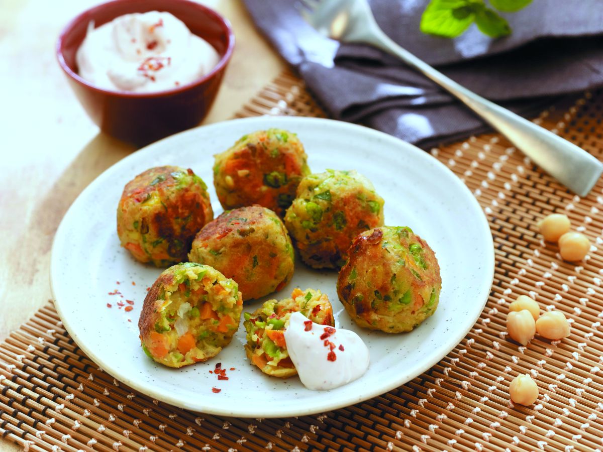 Sestavine: 400 g čičerike, 750 g mešane zelenjave (lahko zamrznjene), 2 stroka česna, 1 žlica limoninega soka, 2 ščepca mlete kumine, 1 žlička pecilnega praška, 1 rumenjak, 4 žlice drobtin, 3 žlice sesekljanega peteršilja, sol, poper, 4 žlice olja.