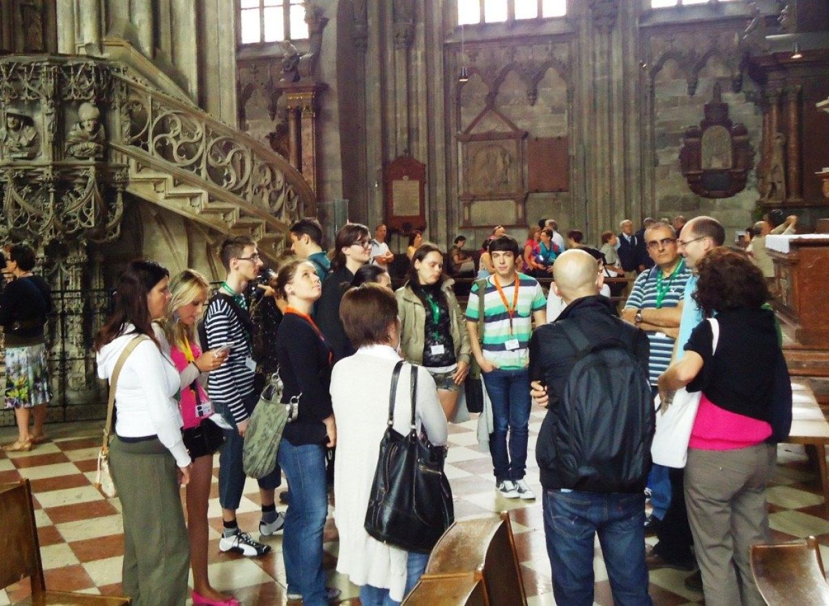 21. junija zjutraj smo se PUMovci odpravili proti Dunaju. Seveda z velikimi pričakovanji. Po dolgih sedmih urah vožnje z vlakom in vmesnimi prestopanji smo prispeli na cilj. Čeprav smo bili na moč utrujeni, se je naša skupina z udeležencema iz Italije dogovorila za skupno večerjo v centru mesta, kjer smo se spoznali in podelili prigode s potovanja. Prihodnji dan so se pričele organizirane aktivnosti; partnerska organizacija z Dunaja – Zavod za promocijo večjezičnosti, medkulturne kompetence in enakega obravnavanja – je za nas organizirala voden ogled Katedrale sv. Štefana, ki se nahaja v samem centru mesta. Ogledali smo si notranjost cerkve in izvedeli nekaj pomembnih informacij o njeni zgodovini. Imenovana je za najpomembnejšo gotsko stavbo v Avstriji, zgrajena je bila v začetku 12. stoletja, do danes večkrat obnovljena ipd. Najprej nas je vodič popeljal na ogled cerkvene ladje, nato pa smo se spustili pod zemljo, kjer smo si ogledali katakombo (podzemno pokopališče). V njej se nahajajo posmrtni ostanki škofov in vladarjev, med drugim tudi grobnica Marije Terezije. Čakal nas je še vzpon na podstrešje katedrale in balkon, od koder smo imeli čudovit razgled po okolici.