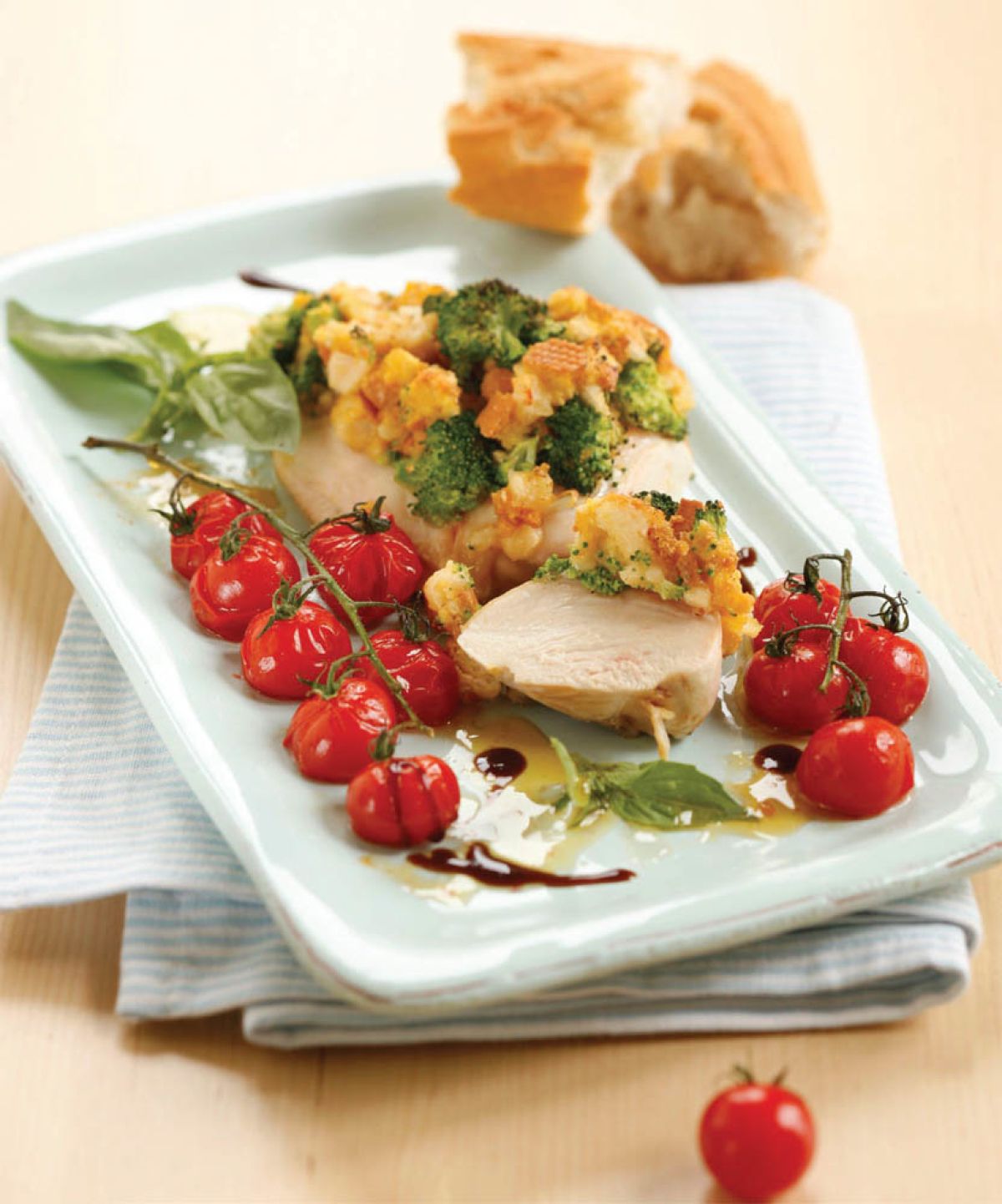- Pečico ogrejemo na 170 stopinj. V skledi stepemo jajci, primešamo kockice žemelj, mleko, parmezan in brokoli, solimo in popramo. Pečene zrezke položimo v plitev pekač in vsakega prekrijemo z zmesjo kruha in brokolija. Zraven položimo še vejice paradižnika, pekač postavimo v ogreto pečico in pečemo 10 minut.