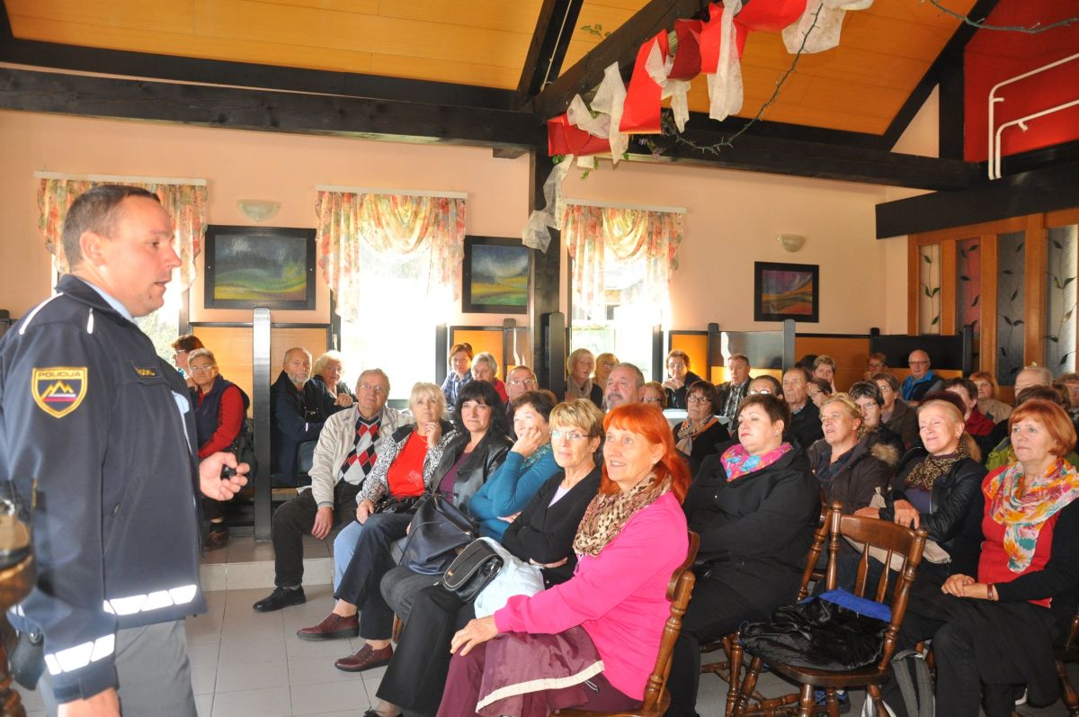 Policist Boštjan, vodja kočevskega področja, nas je seznanil z novostmi v prometni signalizaciji. Povedal je, da ni veliko sprememb, nekaj znakov sicer umikajo, nekaj bodo dodali novih. Znake je tudi pokazal. Z zanimanjem smo prisluhnili, kako se pravilno vozi v krožiščih, o pešcih in njihovi vidnosti. Poudaril je, kako pomembna je kulturna strpnost vseh udeležencev v prometu. Zatem smo pod vodstvom fizioterapevtke Jožice izvedli vaje za razgibanje celotnega telesa, in sicer dihalne, raztezne vaje, vaje sproščanja in vaje za krepitev mišic. Spregovorila je še o pomenu redne telovadbe. Poudarila je, naj spimo na trši vzmetnici z nizkim vzglavjem, počivamo naj tudi čez dan na hrbtu, vsaj 10 do 15 minut, naj bomo vsakodnevno fizično aktivni, pomembno je, da smo optimistični in dobre volje, to je pomembno za zdravljenje, ne pa za ozdravitev. Potreben je čas in napor.