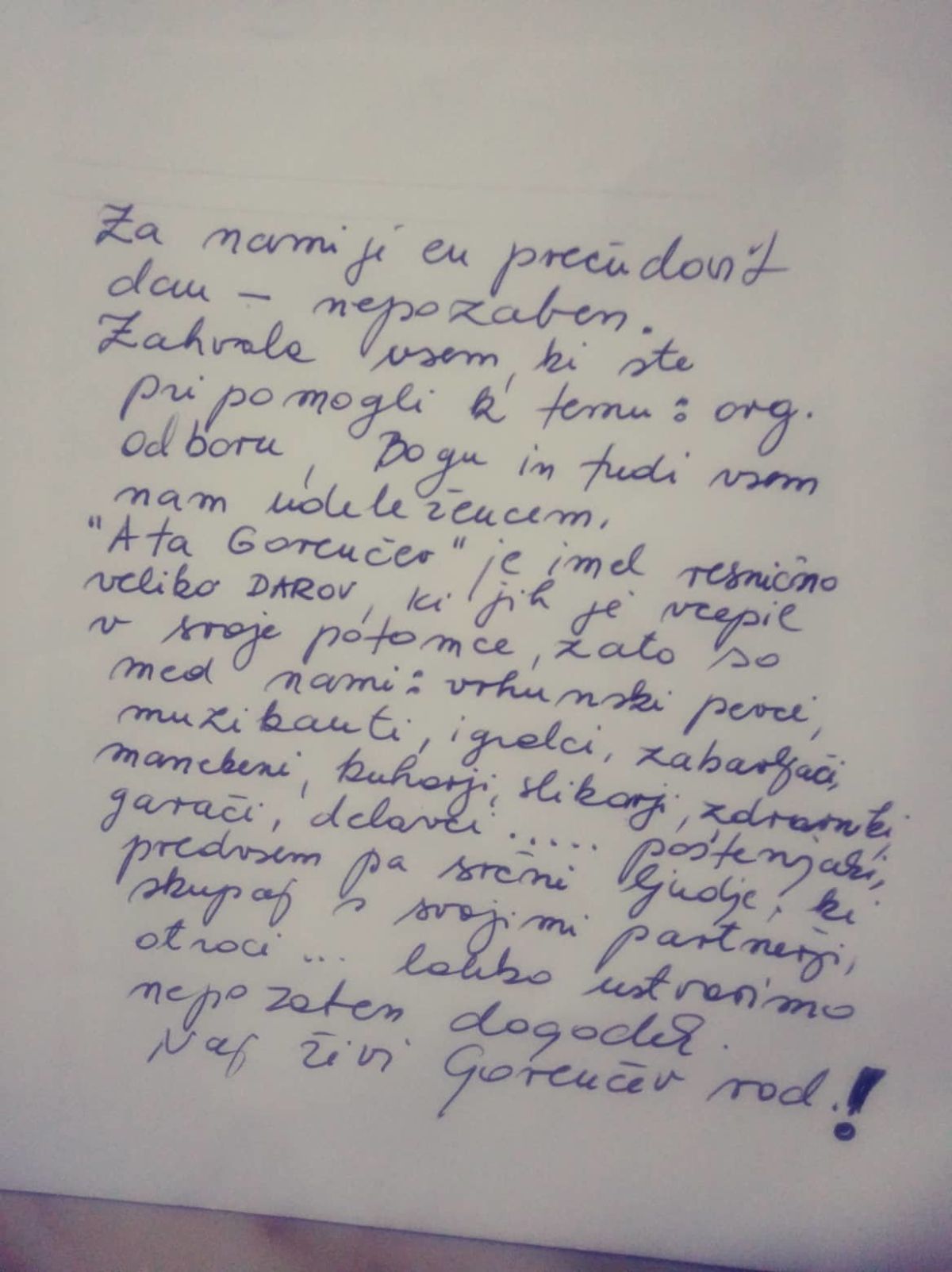 Zbral se je 5. še živeči rod Franca Gorenca, ki je bil rojen 1879 leta in se prvič poročil l. 1909 s prezgodaj umrlo Marijo Berus iz Daljnega vrha, s katero je imel tri hčere, med katerimi je danes tudi nekaj njunih potomcev. Z drugo ženo Ano Udovč iz Črmošnjic se je poročil l. 1919, z njo je imel 9 otok, od katerih sta danes živi še dve hčeri; Majda Židanik, roj. Gorenc, ki letos dopolnjuje 91 let, in Antonija Struna, roj. Gorenc, v starost 87 let; ter ena snaha; Marija Gorenc, rojena Košak, ostalo smo bratranci in sestične z otroki, vnuki in pravnuki.