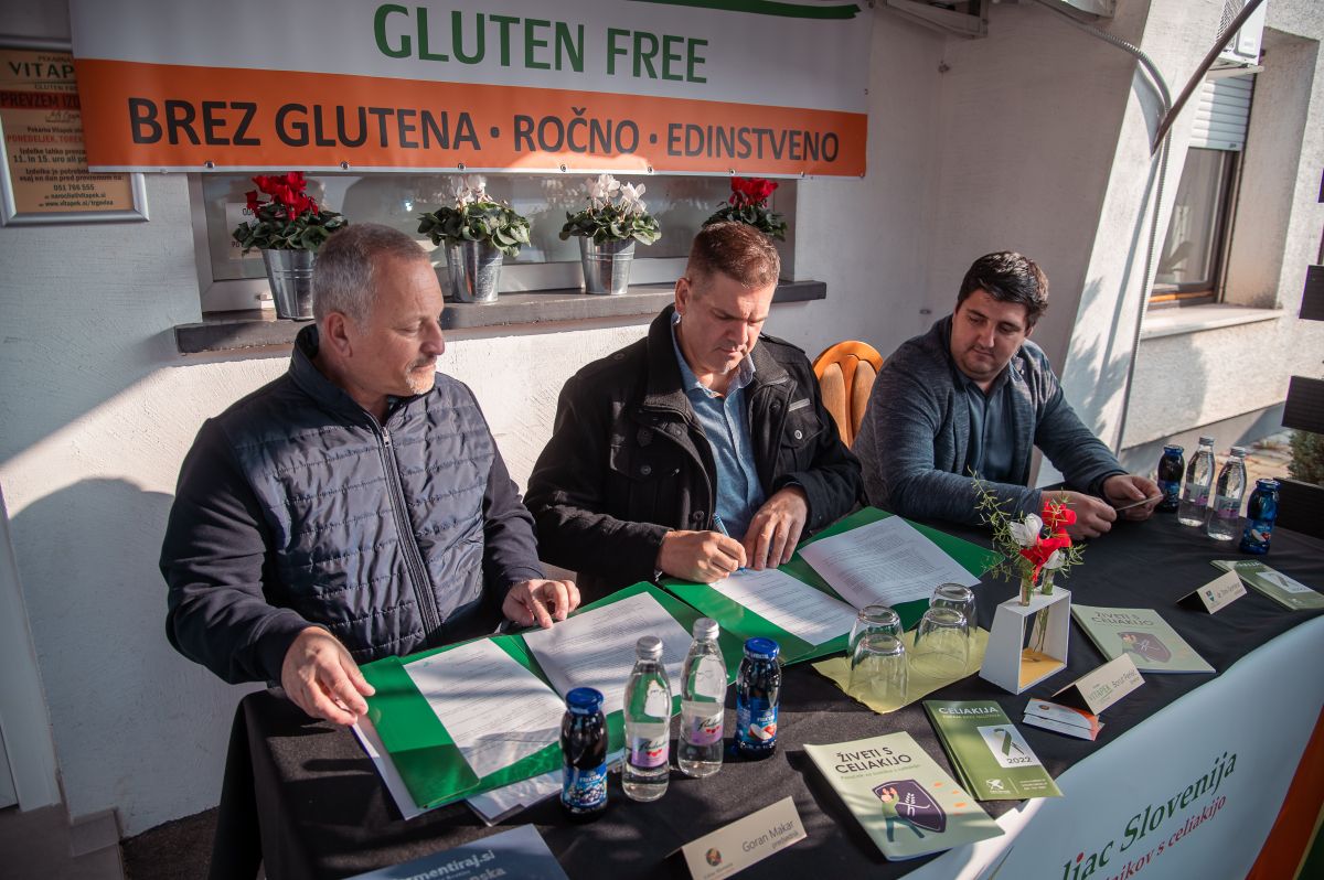 Perkič in predsednik društva Celiac Slovenija Goran Makar sta podpisala tudi dvostransko pogodbo o sodelovanju, ki je hkrati zaveza varnosti in zaupanju, podžupan Mestne občine Murska Sobota Timi Gomboc pa je na vrata pekarne zalepil že omenjeno nalepko.