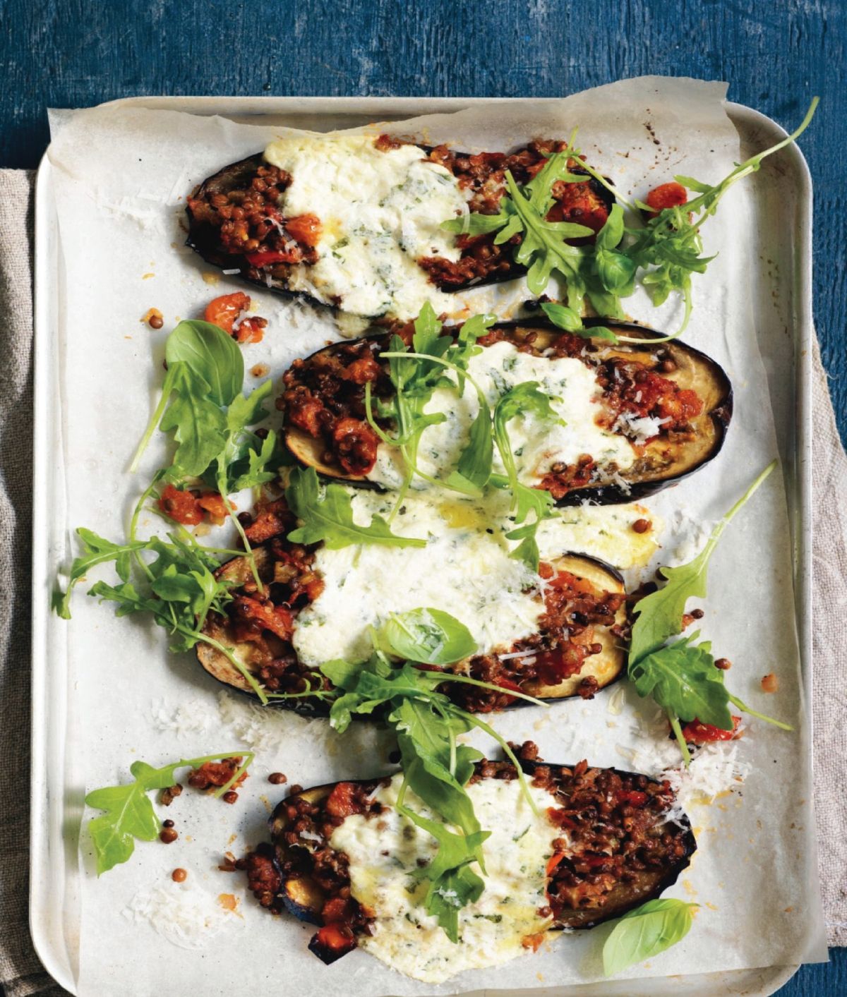 - V skledi zmešamo rikoto, sesekljano baziliko in 30 g parmezana. Vsako pečeno rezino jajčevca namažemo z 1/8 leče in 1/8 rikote, vse potresemo s preostalim parmezanom in pečemo še približno 15 minut. Oprano in dobro odcejeno rukolo posolimo, poškropimo z žlico olja in balzamičnim kisom, premešamo ter postrežemo k jajčevcem.