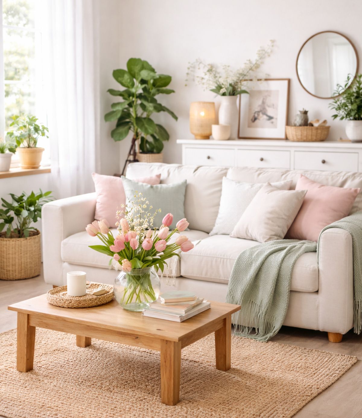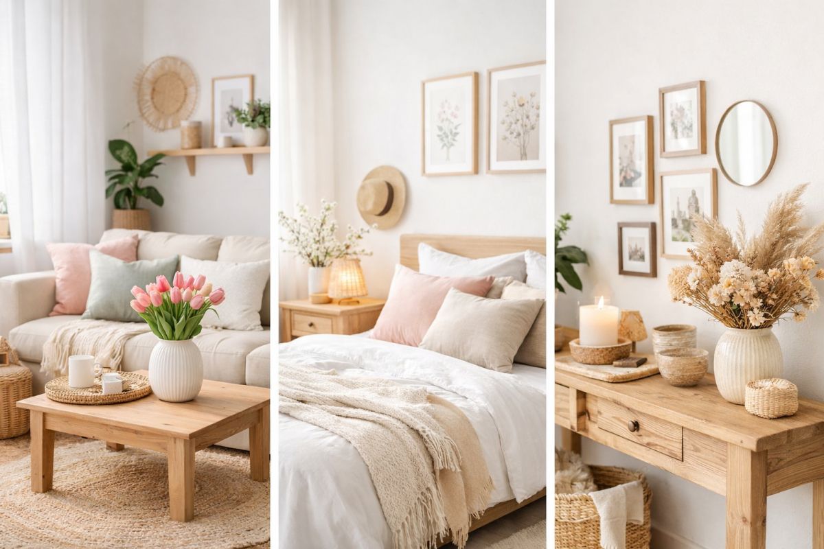 Cvetje, lončnice in naravni materiali so ključni trend pomladnega dekorja. Sveži šopki ali zelene rastline takoj oživijo prostor in izboljšajo počutje.
