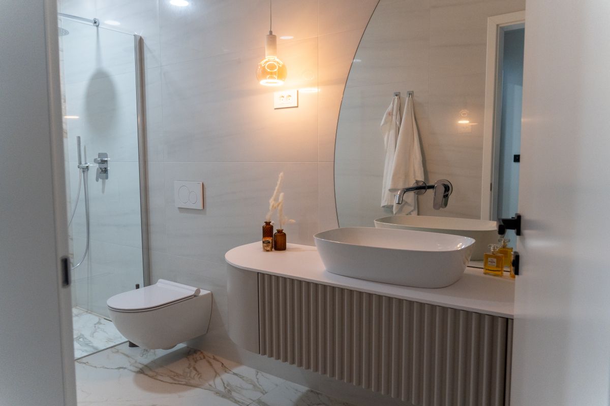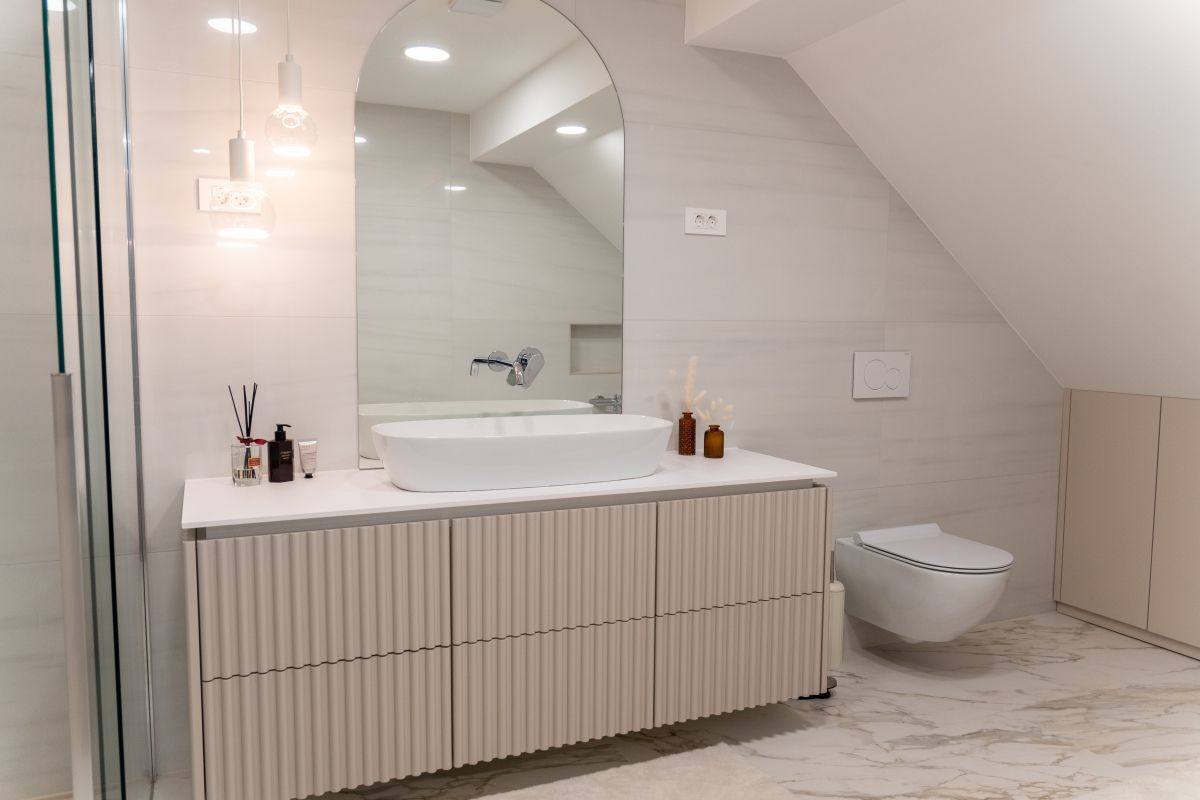 Mislim, da je pravzaprav celoten koncept hiše zasnovan zelo estetsko. Ker pa sem tudi lastnica naravne kozmetike in veliko vsebin za družbena omrežja ustvarjam prav s področja nege kože, bi izpostavila kopalnico (smeh).