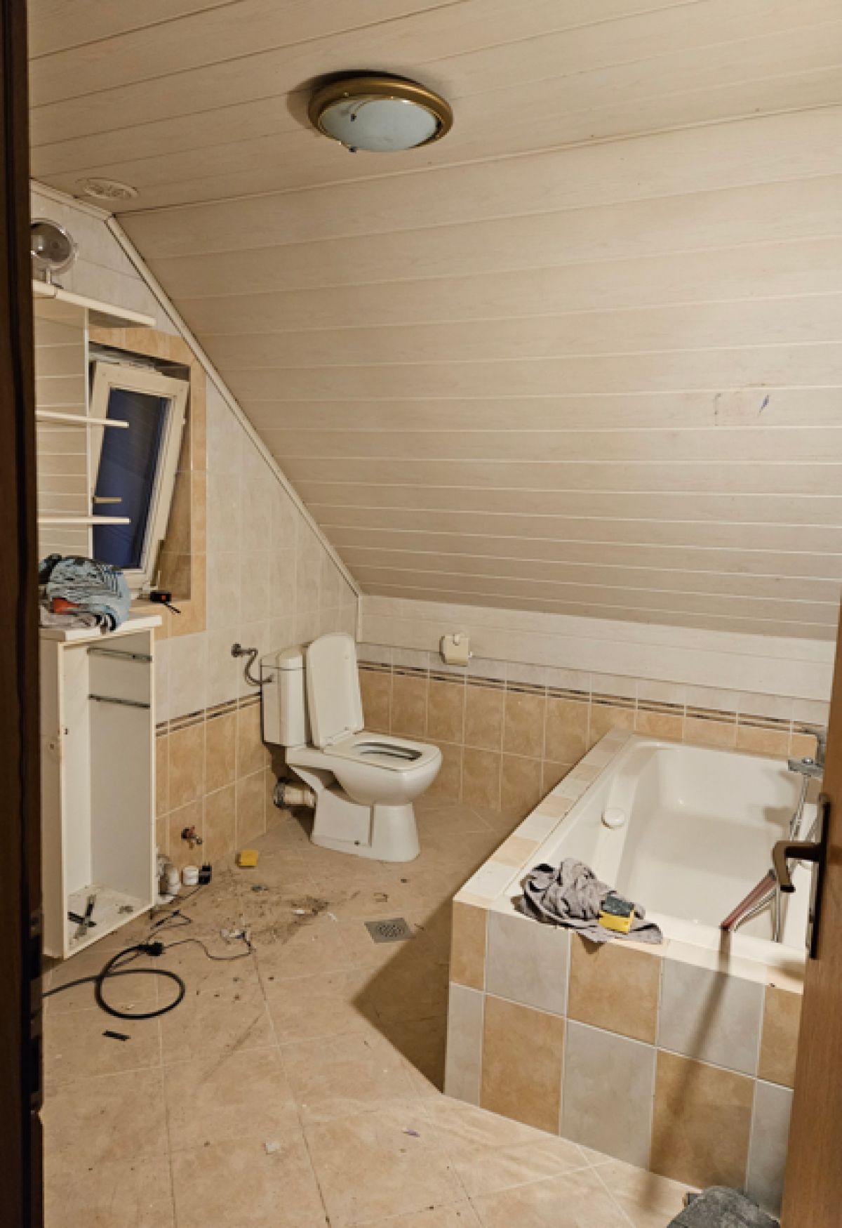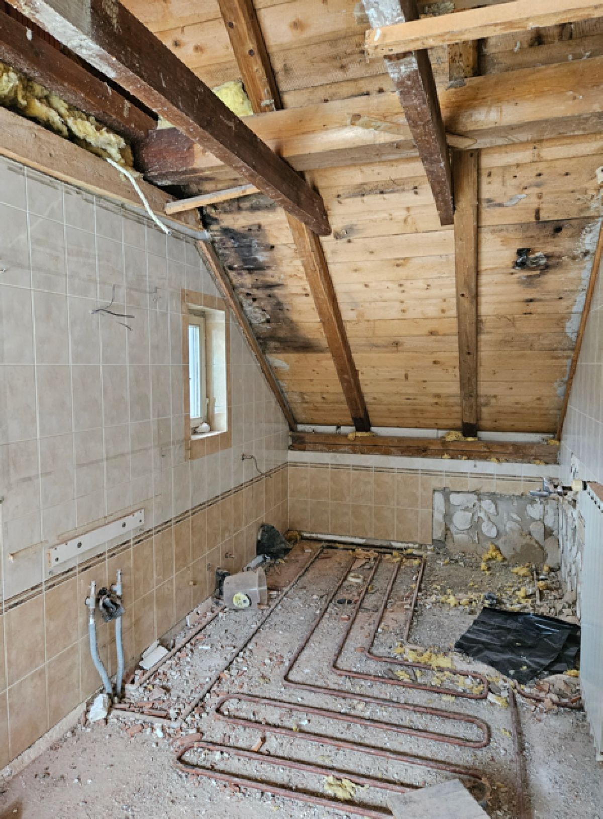 Pred prenovo je bila kopalnica zastarela, s temnimi ploščicami, nizkim stropom in precej neizkoriščenim podstrešnim prostorom. Med obnovo so prostor popolnoma izpraznili, razkrili leseno konstrukcijo strehe in posodobili vse inštalacije.