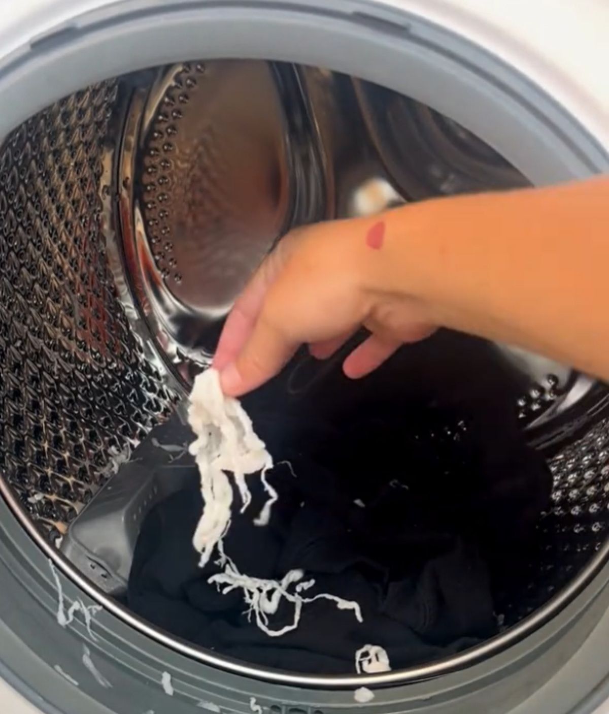 Po takšni nezgodi je dobro obrisati boben in gumo na vratih, preveriti filter in po potrebi zagnati prazen kratek cikel z vročo vodo. Tako preprečite, da bi se kosmiči pojavili še pri naslednjem pranju.