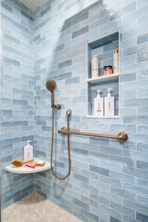 Namesto kombinacije kadi in prhe je bila vgrajena prha z nizkim robom. Takšna rešitev je v zadnjih letih izjemno priljubljena, saj: vizualno poveča prostor, omogoča lažji dostop ter deluje bolj minimalistično in sodobno. Drsna steklena vrata dodatno prispevajo k odprtosti prostora, medtem ko modre stenske ploščice ustvarijo izrazit, a eleganten poudarek.