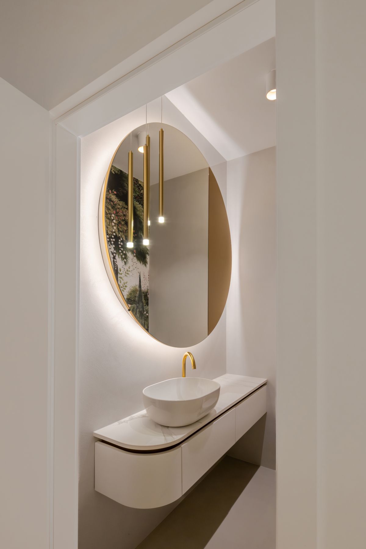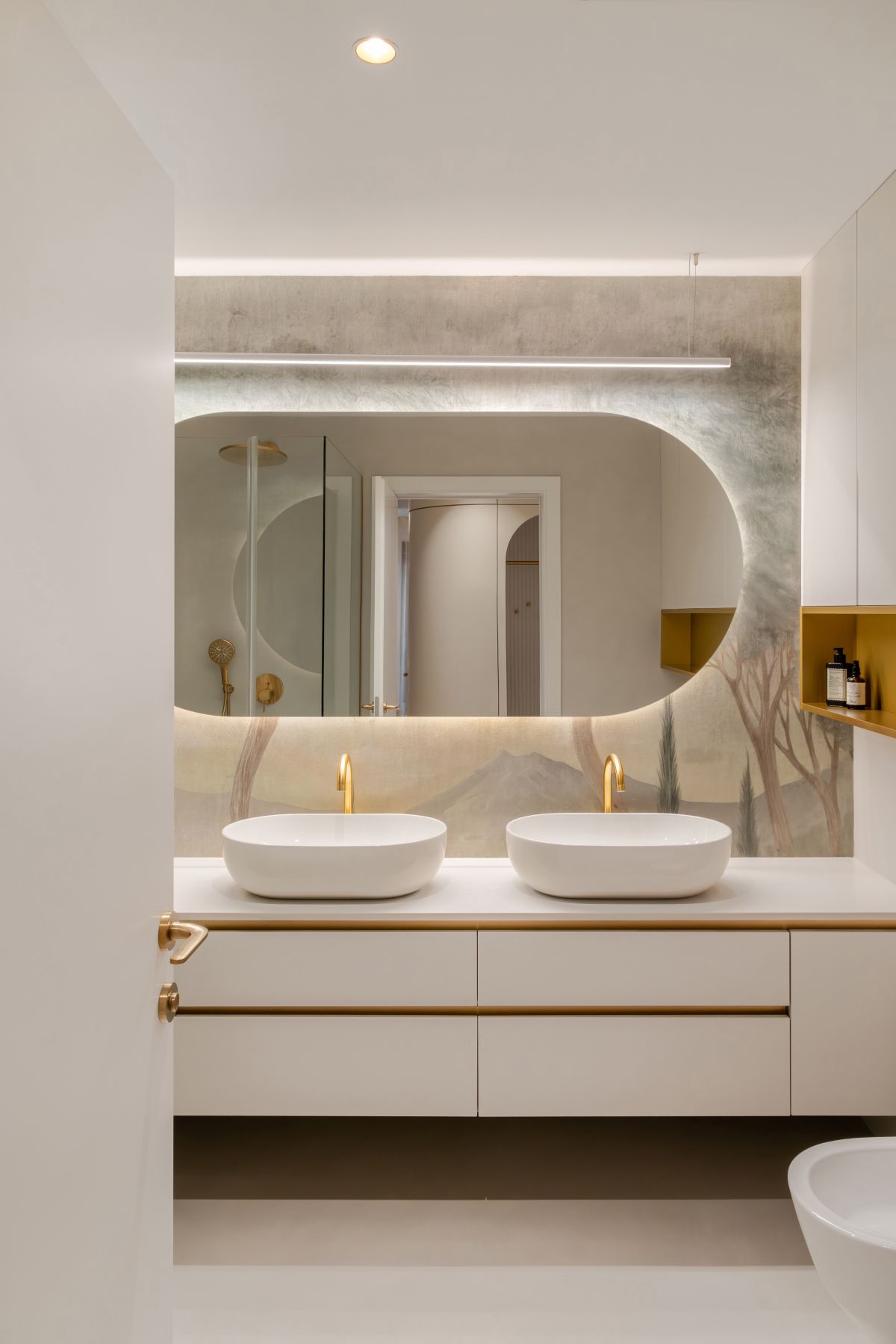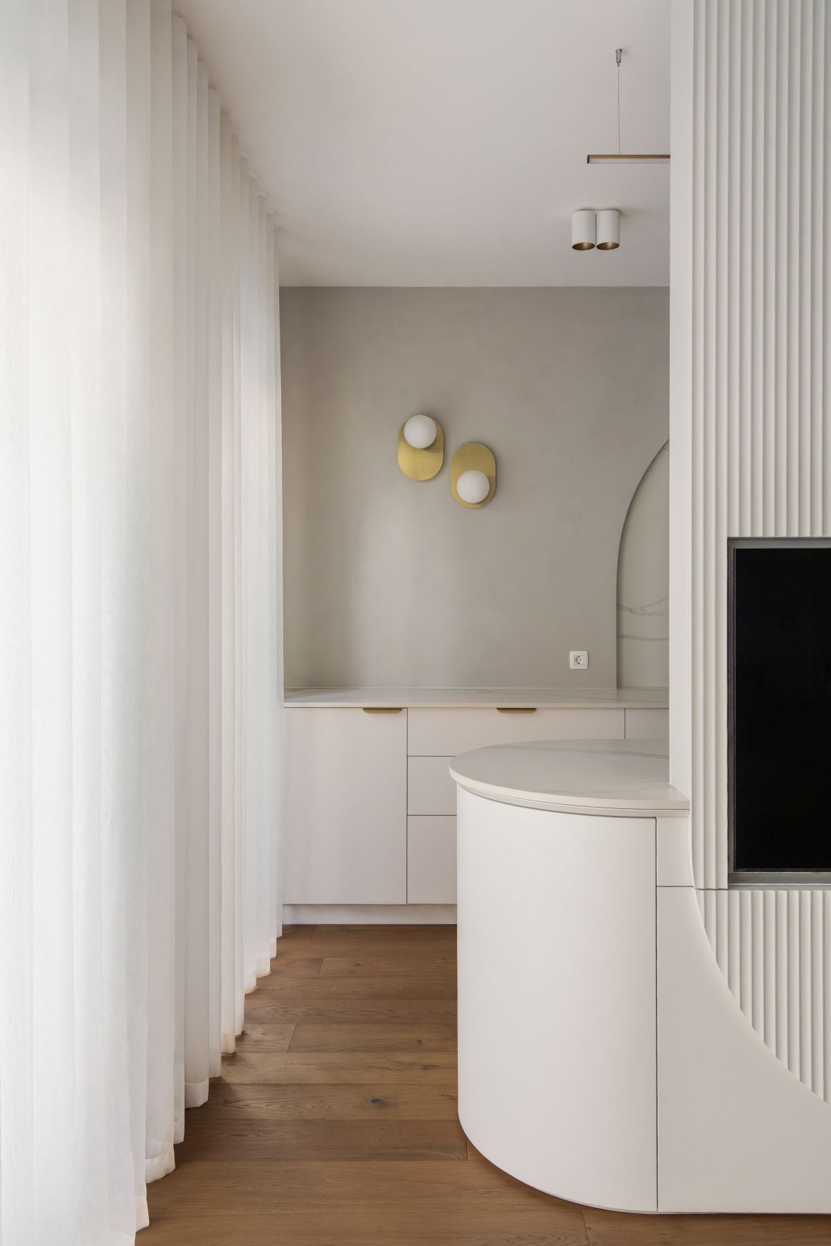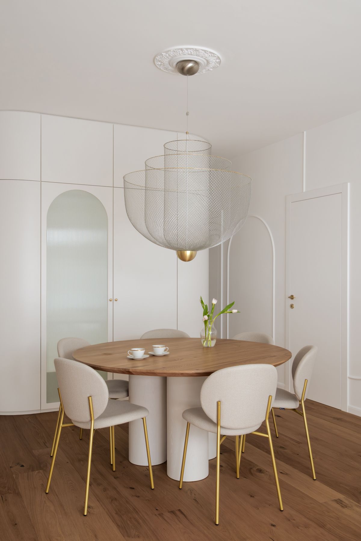 Ajdin slog bivanja bi lahko opisali kot sodobno klasiko, ki združuje eleganco in toplino domačnosti. Prostori temeljijo na svetlih, umirjenih tonih in premišljenih arhitekturnih detajlih, ki ustvarjajo občutek brezčasnosti. Štukature prostoru dodajo subtilen meščanski pridih, medtem ko zaobljene linije v omarah in nišah mehčajo celoto in vnašajo občutek udobja. Celostno podobo dopolnjujejo zlati poudarki v svetilih in dekorju, ki prostoru dodajo kanček prestiža, a hkrati ohranjajo prijetno, sproščeno vzdušje za vsakodnevno bivanje.