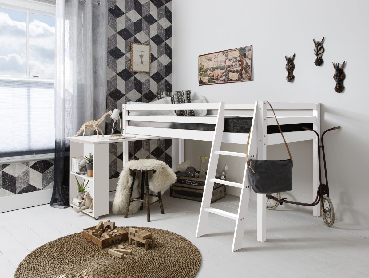 Miza je lahko samostojna ali pa jo pripnete k drugemu kosu pohištva. V tem primeru se drži dvignjene postelje. Ima dovolj prostora za računalnik, ob straneh pa sta praktični polički za odlaganje drobnarij.