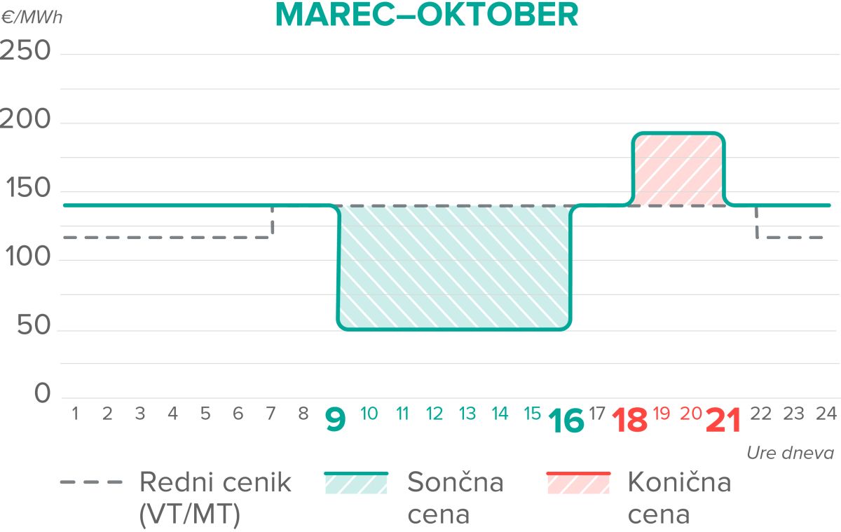 V obeh sezonah so cene najugodnejše čez dan, med 9. in 16. uro v času 'sončnih cen'. Najmanj ugodne pa so med 18. in 21. uro v času 'koničnih cen', zato je treba večjo porabo električne energije iz tega obdobja premakniti, najbolje v čas sončnih ur.