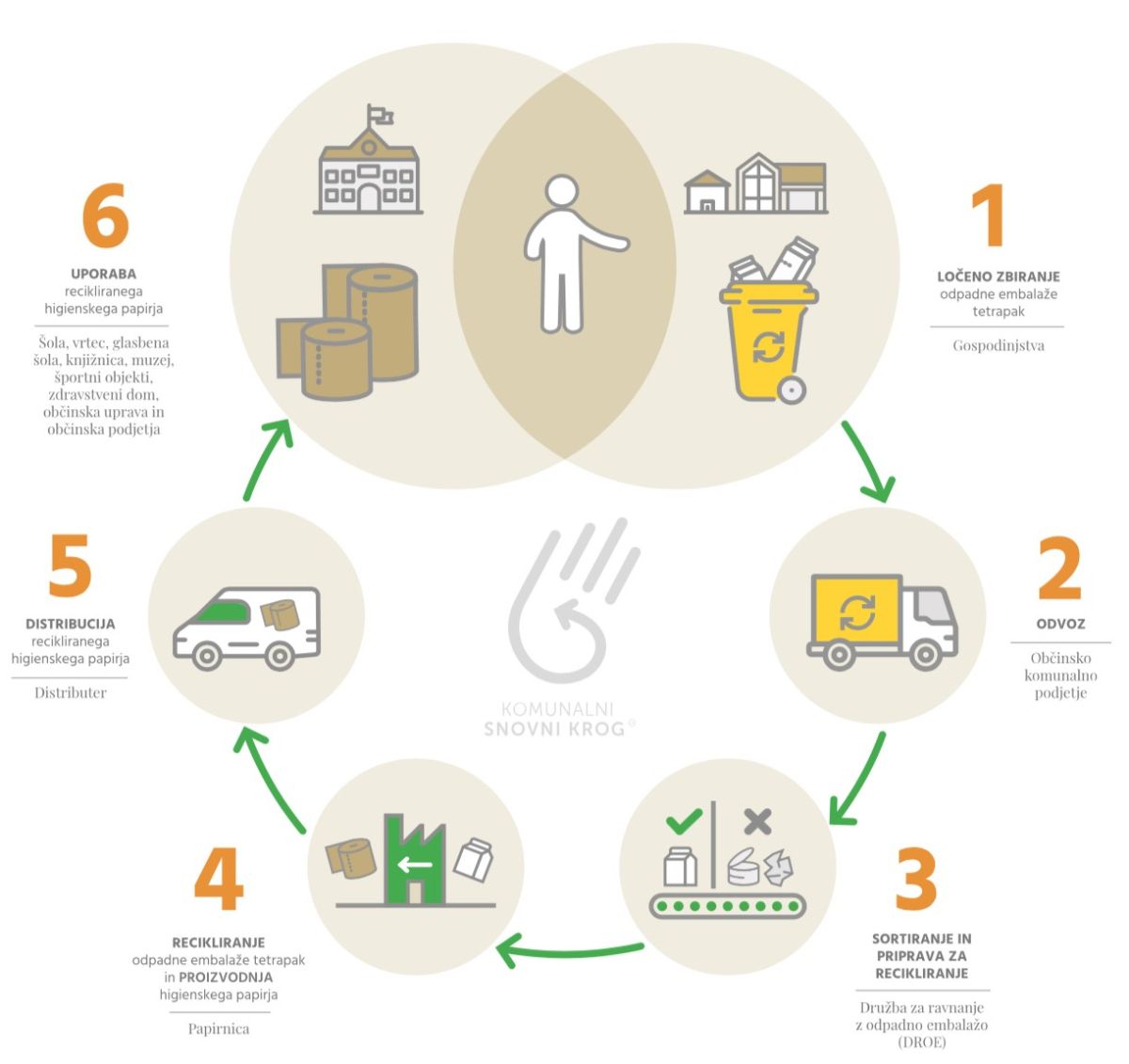 Snovni krog embalaže tetrapak in higienskega papirja je edini krožni program v Sloveniji na področju higienskih papirnatih izdelkov. V tej krožni praksi se komunalno zbrana embalaža tetrapak usmeri v izdelavo recikliranih papirnatih higienskih izdelkov. Snovni krog je sklenjen takrat, ko higienski papir (reciklirane papirnate brisače, robčki, toaletni papir in drugo) začnejo uporabljati javni zavodi, organizacije in podjetja v isti skupnosti, kjer je bila embalaža zbrana. Lani so organizacije in zavodi, vključeni v KSK, uporabili papir iz skupno 758 ton lokalno zbrane embalaže tetrapak. To predstavlja približno 23 % celotne komunalno zbrane embalaže tetrapak v Sloveniji. S tem so zmanjšali izpuste za 569.923 kg CO2 in prihranili 9.123 dreves.