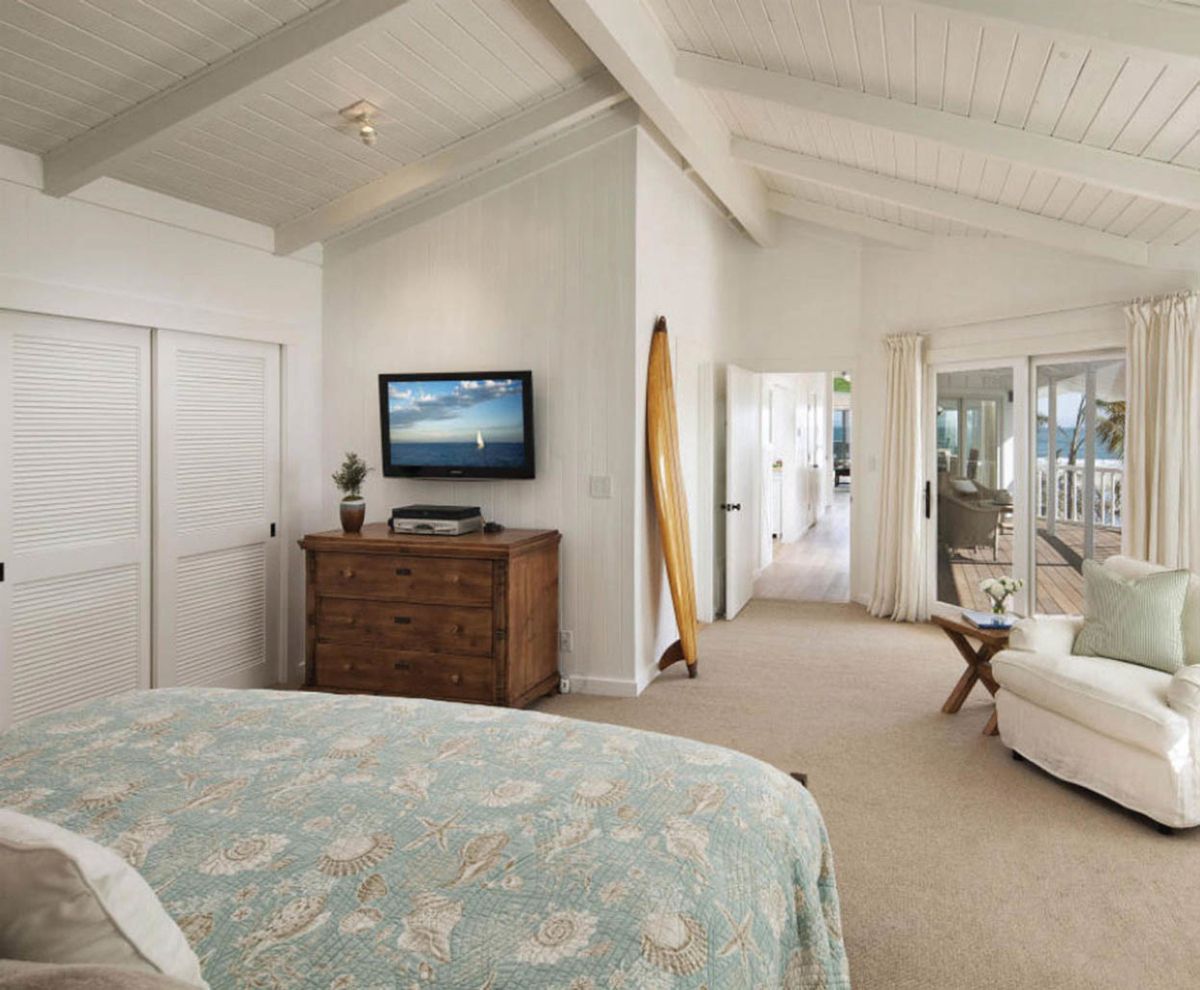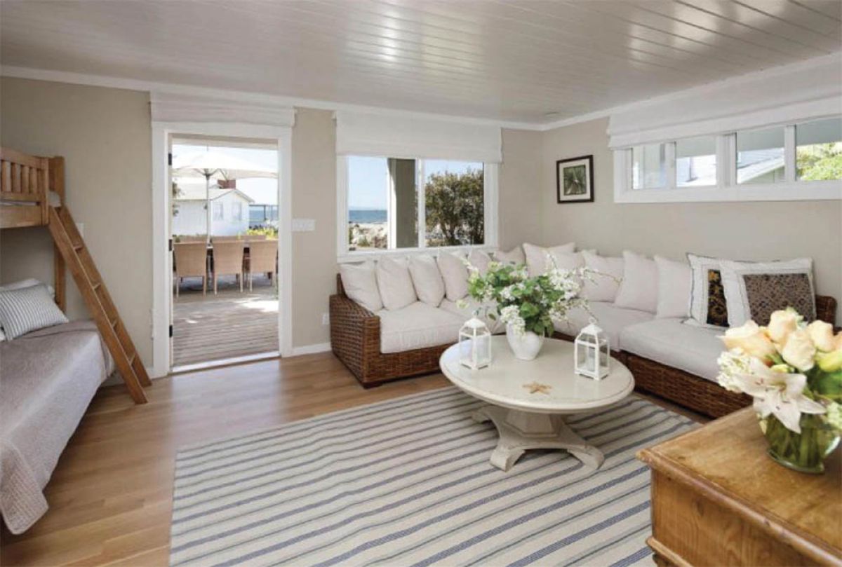 V notranjosti je vila opremljena v značilnem kalifornijskem obmorskem slogu. Prevladujejo svetle barve, predvsem bela – občasno v kombinaciji z modro in z naravnimi toni lesa. Ima kar šest prostornih spalnic in šest kopalnic, v dveh velikih dnevnih sobah pa je dovolj udobnih površin za počitek in uživanje ob gledanju televizije ali družinsko crkljanje. Obe imata tudi kamin, ki ob kakšnem malce hladnejšem večeru zagotovi prijetno toploto in tudi kanček romantike.