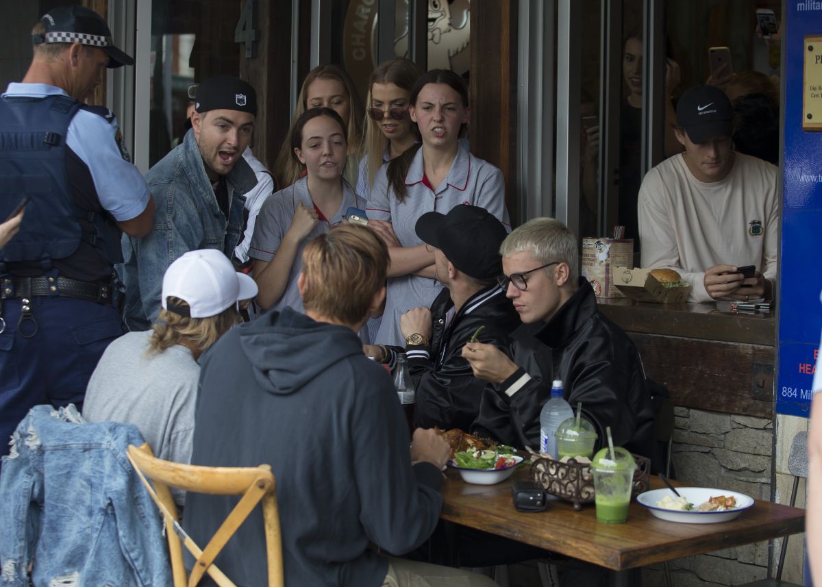 Fotografija je nastala v petek popoldne v Sydneyju. Justin je skupaj s svojim spremstvom sedel za mizo k obedu, medtem ko je veduto zastiral trop oboževalk in oboževalcev. Ki bi se najverjetneje zgrnili nadenj, če jih ne bi brzdali s pendreki oboroženi varuhi postave.