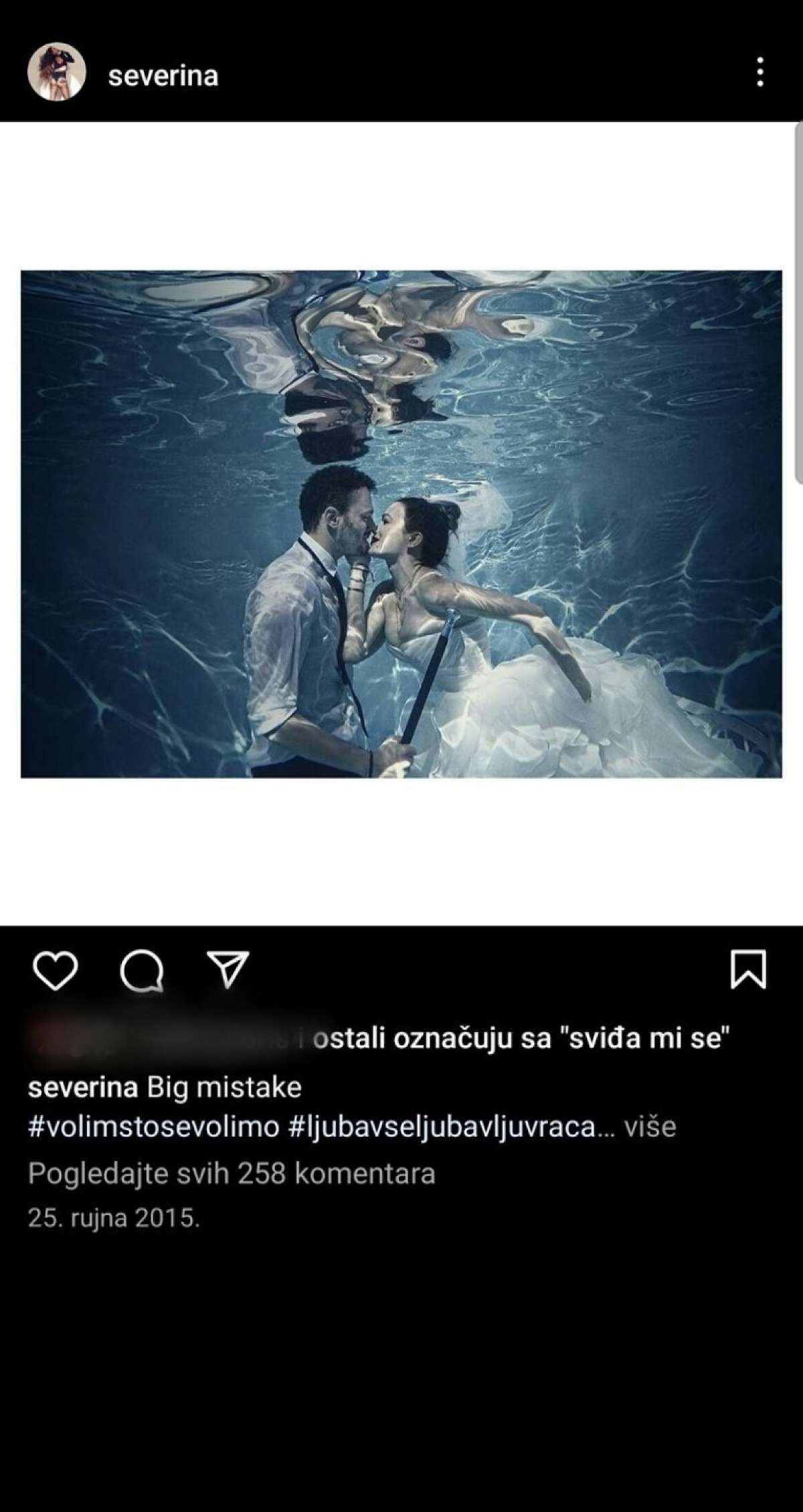 Prav slednji so namreč pretekli vikend opazili, da je priljubljena hrvaška pevka Severina pri objavi poročne fotografije iz leta 2015 spremenila opis. Hrvaška zvezdnica je pod romantični utrinek z nekdanjim soprogom Igorjem Kojićem napisala dve besedi: »Velika napaka.« Pod poročno fotografijo, na kateri se z nekdanjim soprogom Igorjem Kojićem poljublja pod vodo, je takrat namreč zapisala: »Dragi moj, greh bi bil, če se ne bi srečala.« Sprememba opisa pod fotografijo prihaja dve leti po tem, ko sta se zakonca sporazumno ločila.