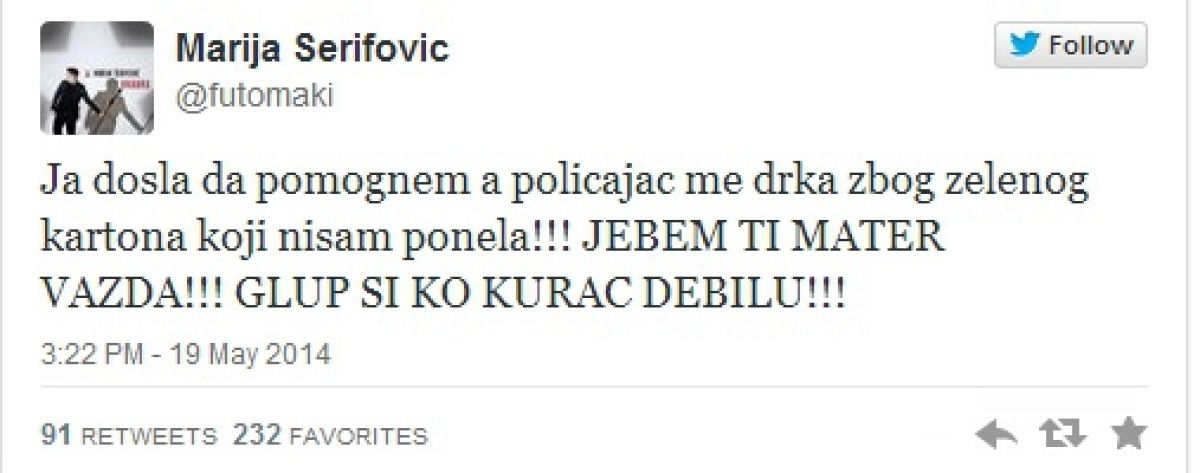 Marija Šerifović, srbska pevka, ki je leta 2007 zmagala na Eurosongu, je hotela pomagati ljudem, ki so jih prizadele poplave, a je policist ni spustil v Sarajevo, ker ni imela zelene karte.