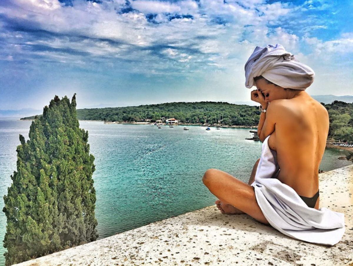 Maja Šuput si je privoščila nekaj kratkih dni na Krku, kjer je nastala tudi tale zapeljiva fotografija. Maja sedi na plaži, razgaljene prsi pa si pokriva z brisačo.