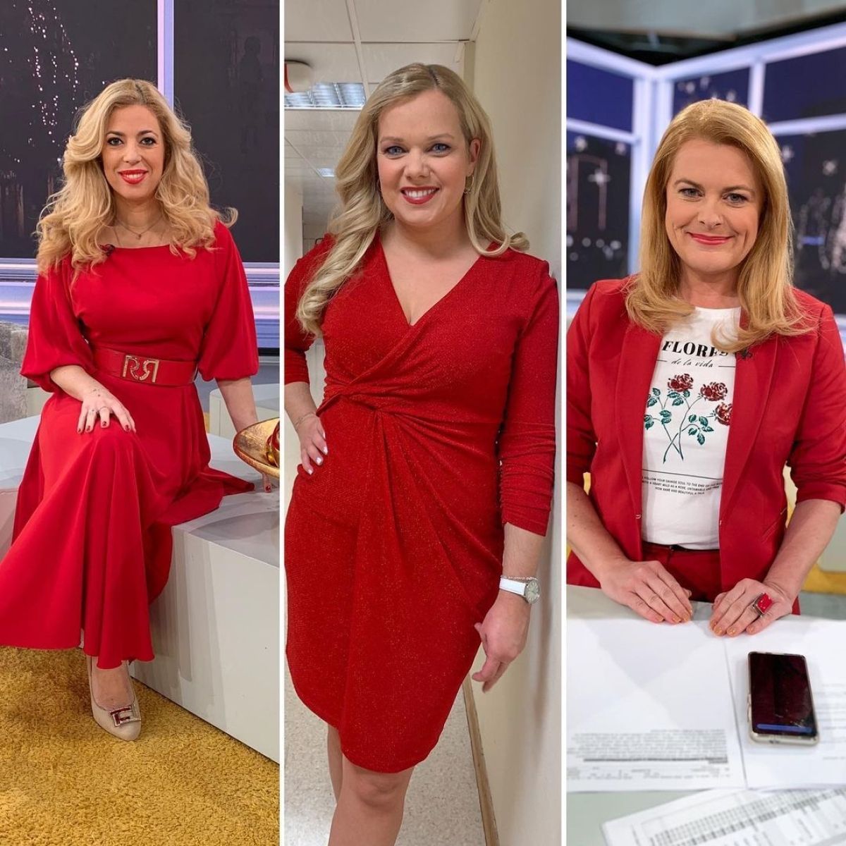 Vsi, ki spremljamo priljubljeno jutranjo oddajo Dobro jutro, smo opazili, da je bil rdeča nit prejšnjega tega tedna rdeča. Ana, Špela in Monika so blestele v rdečih kreacijah, ena izmed gledalk pa je na Instagramu ob tem zapisala: »Lepe in srčne.« Ja, res so srčne, poleg tega pa je tudi res, da dekletom rdeča še kako pristaja, ne nazadnje je to tudi barva, ki jo radi povezujemo z veselim decembrom, kajne?