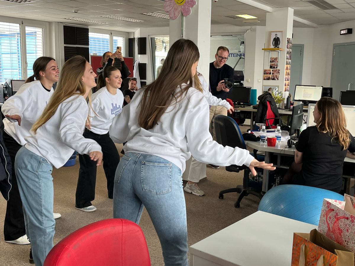 Presenečenja ob njenem jubileju so se začela že ob njenem prihodu v službo. Ko se je v redakciji pripravljala na program, so se izza vogala pojavile plesalke Plesnega mesta in ji pripravile flashmob na njeno priljubljeno pesem Made you look od Meghan Trainor. Nato pa se je prikazal še njen ljubi Roši v povsem roza opravi in ji čestital s torto z roza kačo na vrhu.
