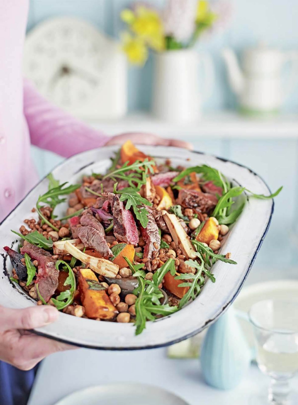 Pisana zelenjava, oreščki, žajbelj, sočen rostbif in pira poskrbijo za preplet tekstur in okusov, za piko na i pa pripravimo še slasten preliv.