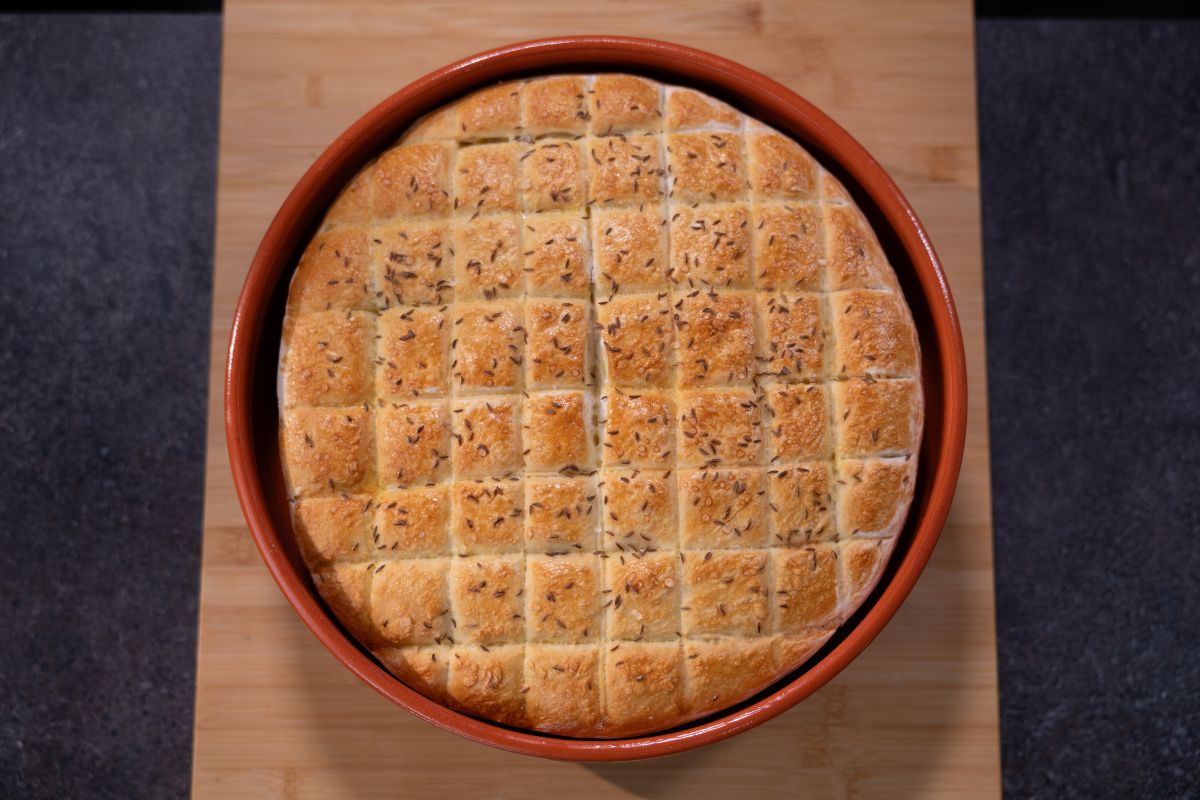- Pogačo premažemo z razžvrkljanim jajcem, potresemo z grobo soljo in semeni kumine. Ponovno nežno premažemo z jajcem, da se semena dobro zalepijo na testo. Pogačo prestavimo v pečico, ogreto na 180 stopinj, in pečemo 20 minut.