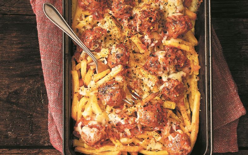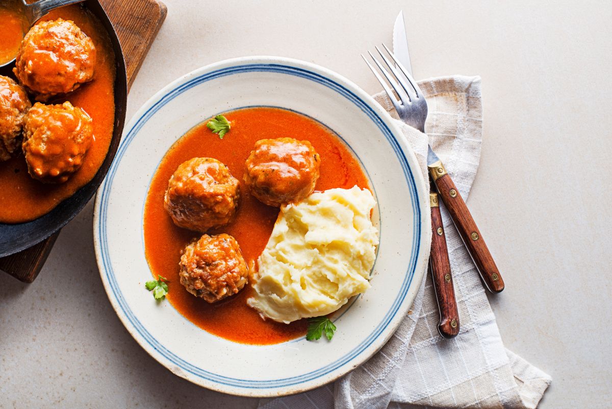 Krompirček s paradižnikovo omako in mesnimi kroglicami