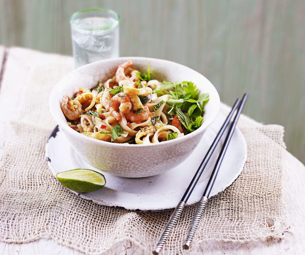 Recept združuje riževe rezance, čili, ingver, sveža zelišča, jajca in rakce. Rezance skuhamo, v sezamovem olju na hitro popražimo jajce, dodamo čili in ingver, nato še rezance, rakce in sojino omako. Na koncu primešamo še limetino lupinico, limetin sok in sveža zelišča ter posujemo z arašidi. Celotna priprava traja okoli 30 minut in navduši tako z norimi aromami in barvitostjo.
