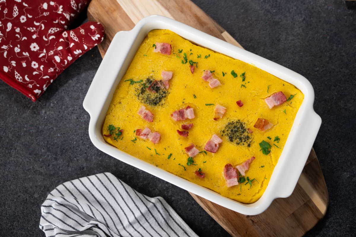 - Pekač naoljimo in vanj preložimo polovico polente, njeno površino poravnamo z lopatko in posujemo z večino slanine, ki smo jo narezali na rezine ali drobne kocke. Prekrijemo s preostalo polento, ponovno zgladimo površino in posujemo s preostalo slanino. Polento premažemo s preostalim zeliščnim maslom in 15 min pečemo v pečici, ogreti na 180 stopinj.