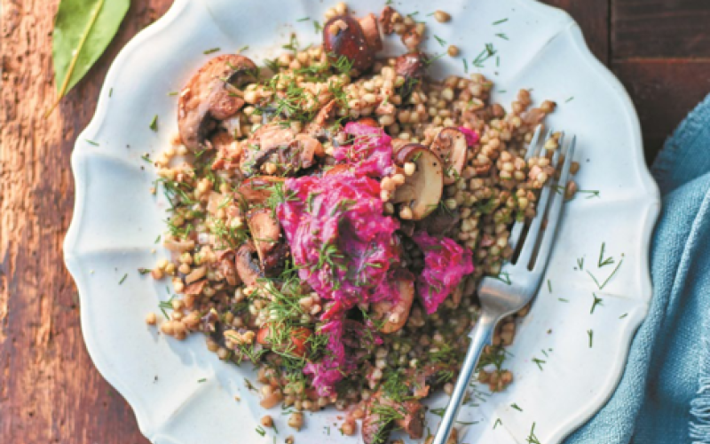 Ajdova kaša z gobami in pesno kremo