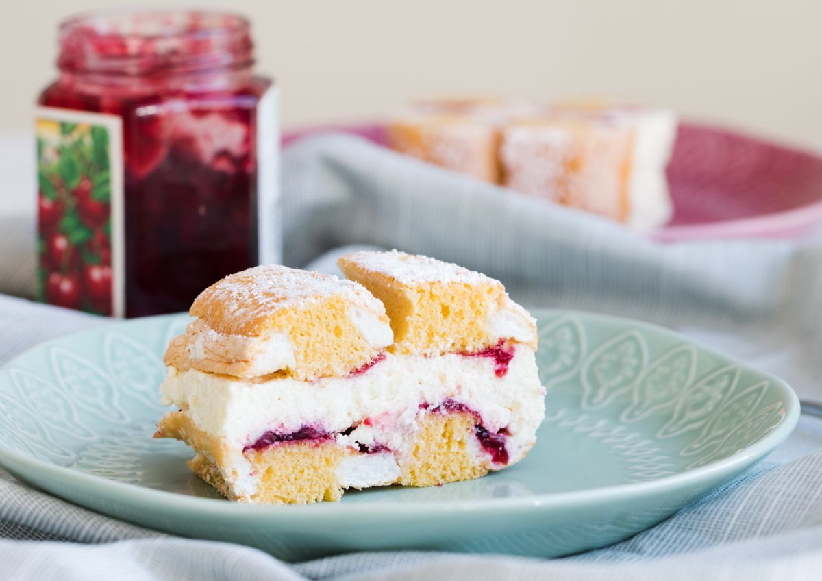 - Kremo razporedimo po spodnji plasti peciva in postavimo v hladilnik za 2 uri. Še preden se krema povsem strdi, na vrh položimo še drugo plast biskvita. Da krema ne bi pobegnila ob robovih, si lahko pomagamo z ovojem iz papirja za peko, ki ga pred postrežbo odstranimo.