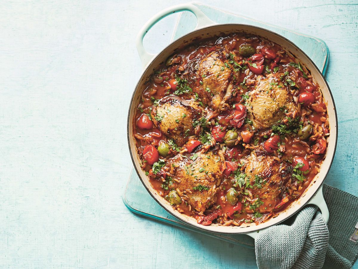 Sočen piščanec 'alla cacciatora' s testeninskim rižkom v paradižnikovi omaki z zelišči, oljkami, kaprami in rdečim vinom pripravimo v enem loncu.