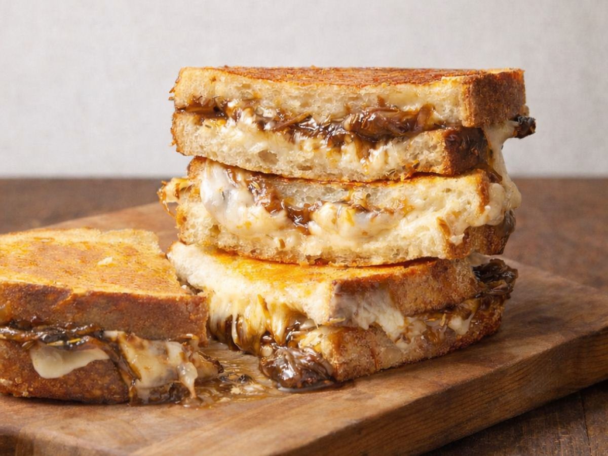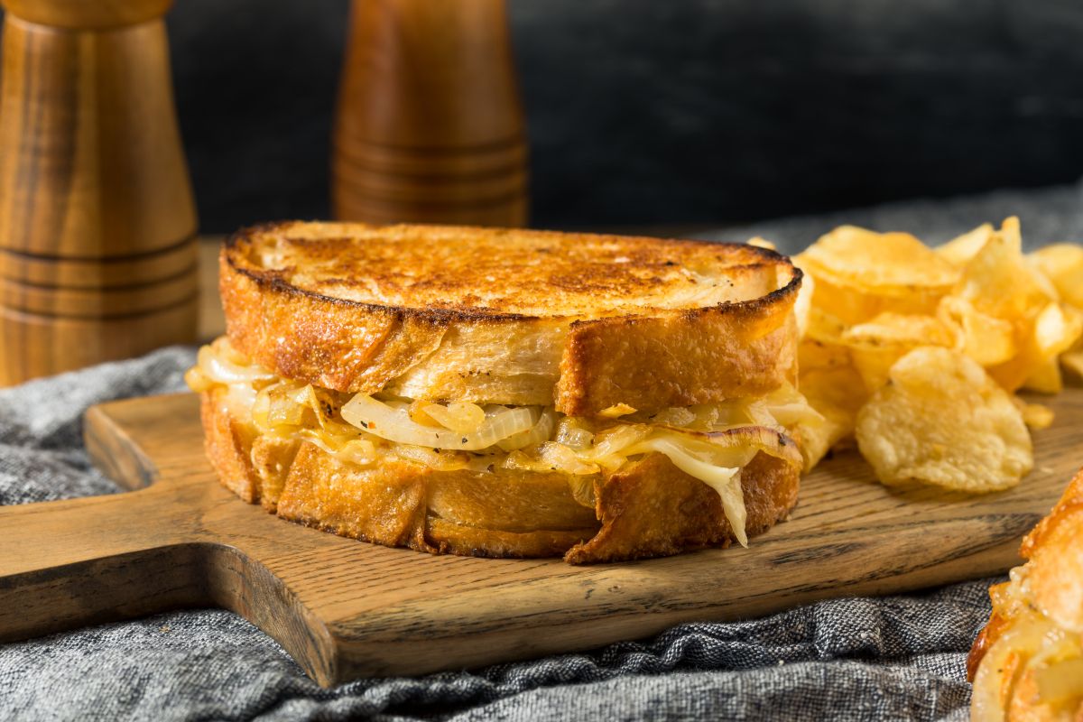 Topli sendvič, h kateremu se bomo vedno znova vračali, združuje sladkobo pražene čebule z bogatim okusom sira grojer (ali mešanice sirov) ter hrustljav maslen kruh. Odličen je kot samostojen prigrizek, lahko pa ga pomakamo tudi v juho.