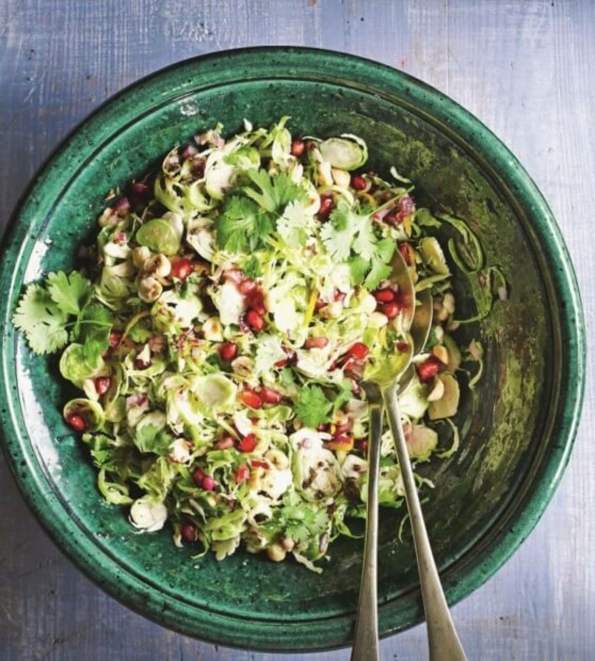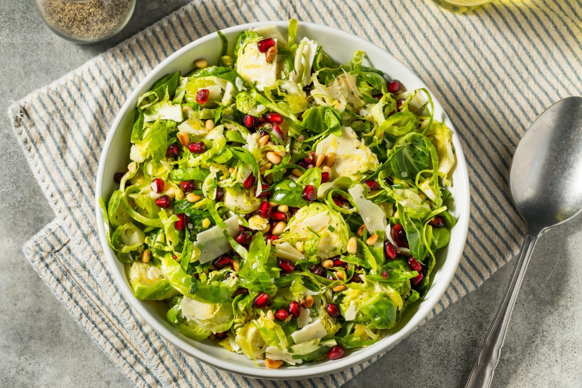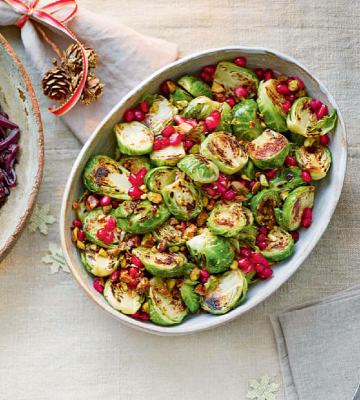 Pražen brstični ohrovt s pistacijami in granatnim jabolkom