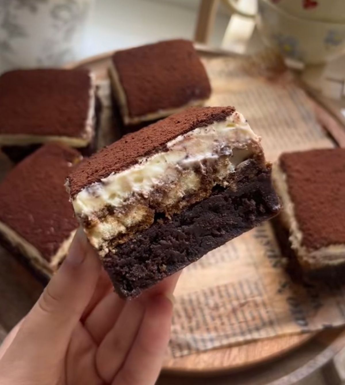 Sočne čokoladne rezine z mehko plastjo biskvitnih piškotov, namočenih v kavo, in bogato mascarpone kremo. Popolna sladica, ko si hkrati zaželiš brownija in tiramisuja.