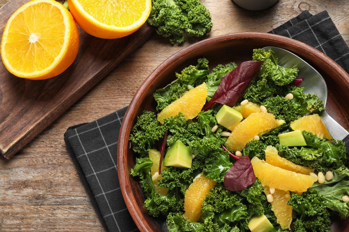 Kodrolistni ohrovt, pršut in mandlji poskrbijo za zanimivo kombinacijo tekstur in okusov. Po želji lahko solato dopolnimo še s trdim ovčjim sirom.