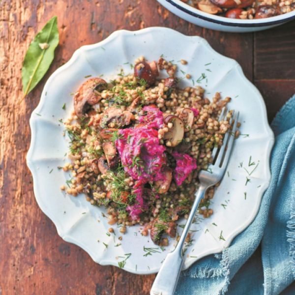 V ajdovo kašo vmešamo gobe in po okusu dosolimo. Postrežemo v skodelah, na vrh dodamo pesno kremo in okrasimo s koprovim zelenjem.