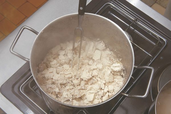 Medtem ko se zelje kuha, pripravimo žgance in klobaso. V loncu pristavimo vodo za žgance in jo solimo. Ajdovo in belo moko pomešamo in jo naenkrat vsujemo v krop. Lonec pokrijemo in počakamo kakšnih 5 minut, da voda zavre čez moko. S kuhalnico naredimo sredi kupčka moke luknjo, pokrijemo in kuhamo še 10 minut, da voda dobro prevre tudi v sredini.