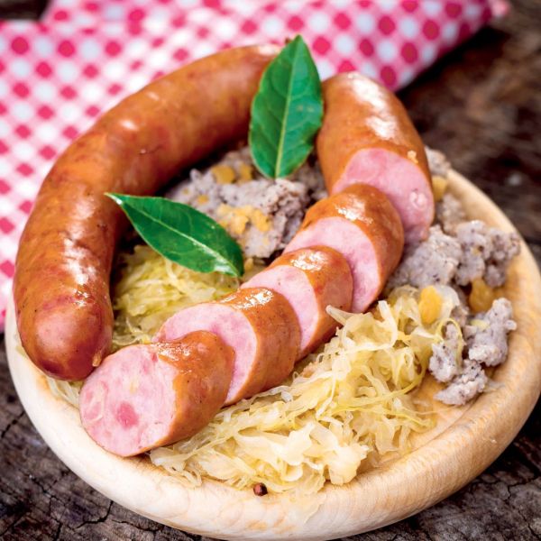 V večjem loncu zavremo vodo in klobase kuhamo 8 minut. Postrežemo jih z zeljem in žganci.